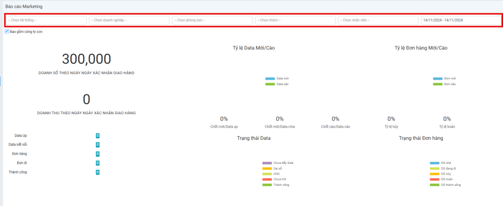 Bộ lọc: theo nhân viên MKT, theo nhóm MKT,... (như hình bên dưới) giúp quản lý đánh giá hiệu quả thay đổi theo chuỗi thời gian.