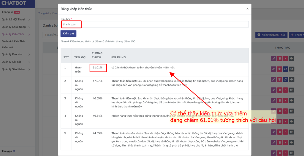 Để kiểm tra kiến thức vừa training cho bot, nhấn Kiểm thử Kiến Thức → nhập câu hỏi () → nhấn Kiểm thử → xem kết quả hệ thống gợi ý.