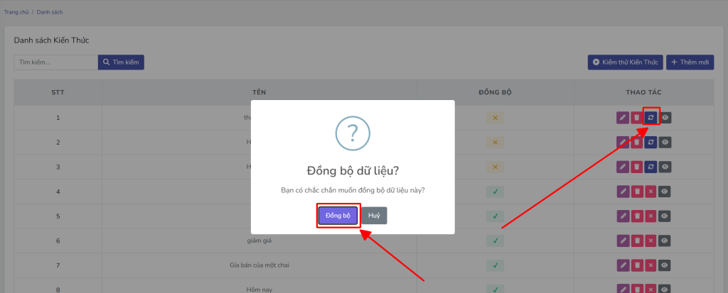 Nhấn nút Đồng bộ ở dòng kiến thức vừa tạo → chọn Xác nhận.