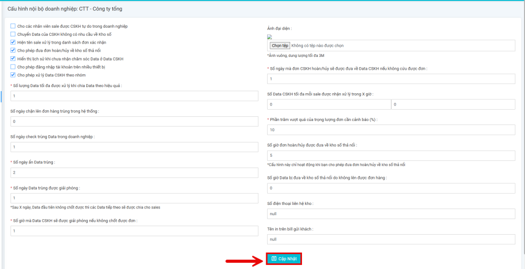 Màn hình hiển thị thông tin cấu hình nội bộ của doanh nghiệp. Người sử dụng điền đầy đủ thông tin sau đó click vào “Cập nhật” để cập nhật cấu hình nội bộ doanh nghiệp.