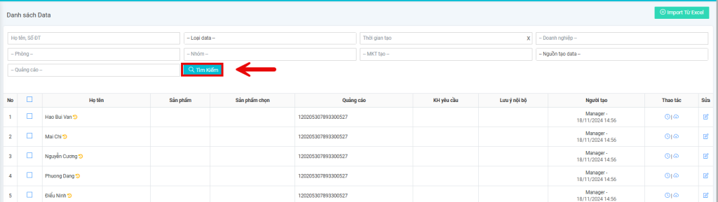 - Nếu người sử dụng muốn tìm kiếm data theo điều kiện thì click vào “Tìm” để lọc danh sách data theo các điều kiện như hình bên dưới