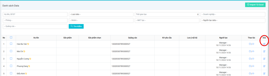 - Ngoài ra, người sử dụng có thể nhấp vào biểu tượng “Sửa” để chỉnh sửa thông tin data.