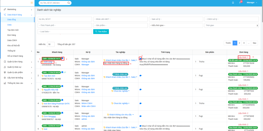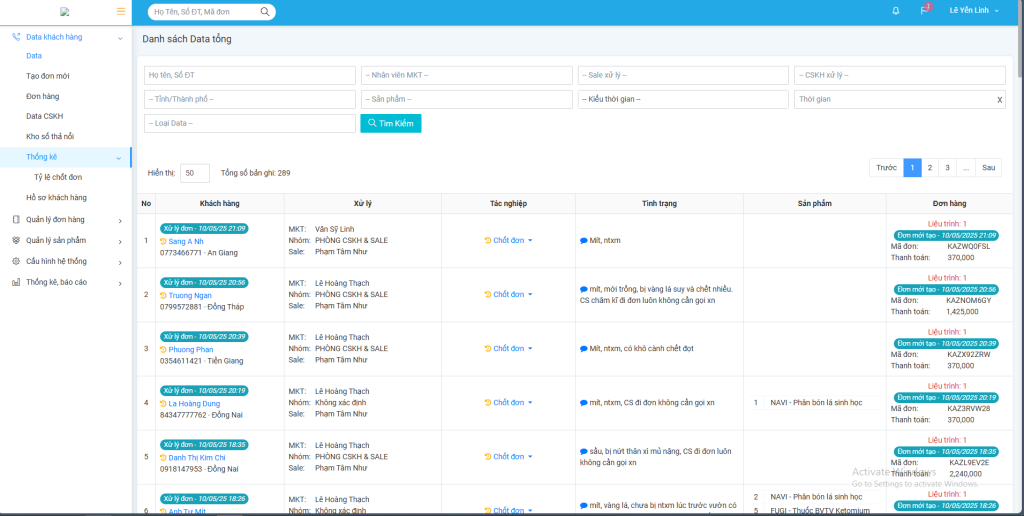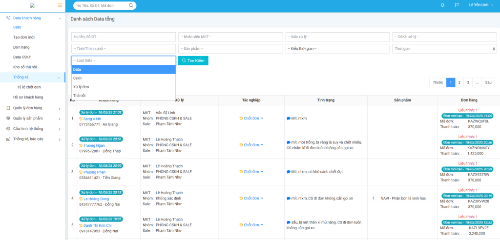 • Phòng Kinh Doanh: xem được toàn bộ 4 loại data (data, CSKH, xử lý đơn, thả nổi).