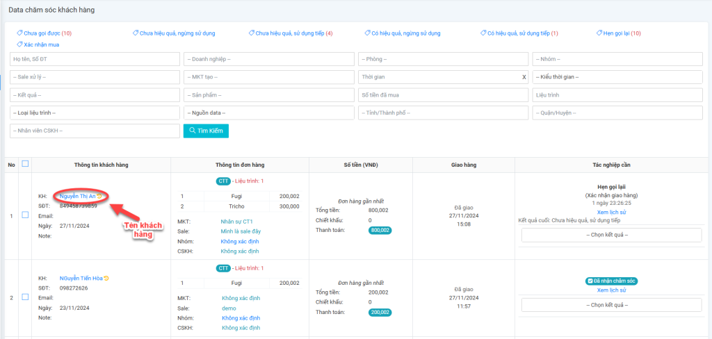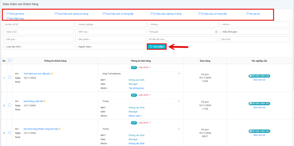 • Người sử dụng nhấp vào tên tác nghiệp cần để lọc danh sách khách hàng đã giao hàng thành công cần CSKH theo “Tác nghiệp cần” hoặc click vào “Tìm” để lọc theo các điều kiện như hình bên dưới.