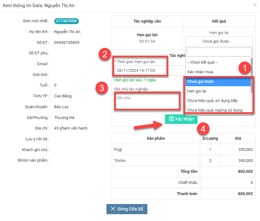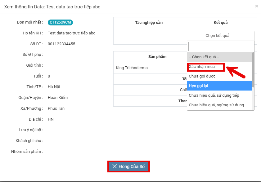 • Nếu nhân viên kinh doanh tư vấn thành công và khách hàng xác nhận mua hàng, nhân viên kinh doanh chọn trạng thái tác nghiệp “Xác nhận mua”.