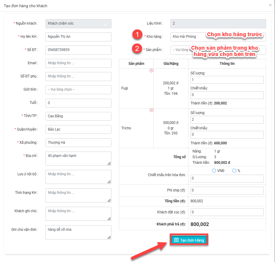 • Lúc này trên màn hình hiển thị pop-up “Tạo đơn hàng cho khách hàng”. Nhân viên kinh doanh điền đầy đủ thông tin khách hàng, thông tin đơn hàng và thao tác “Tạo đơn hàng”.