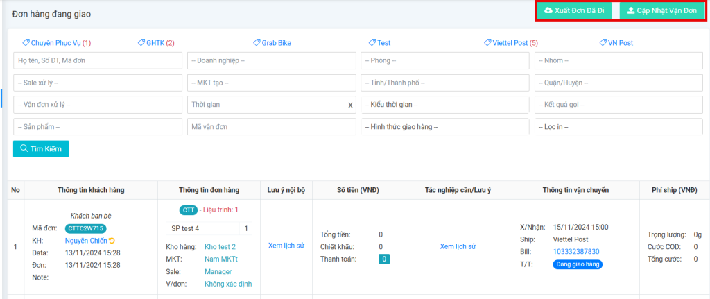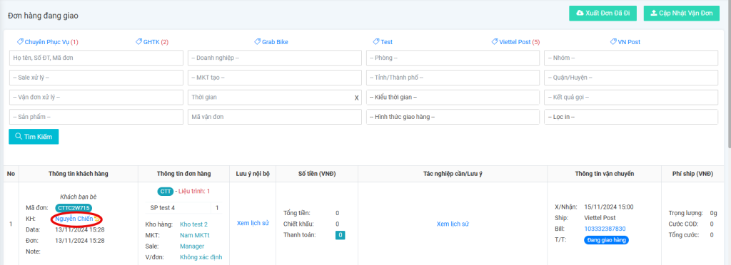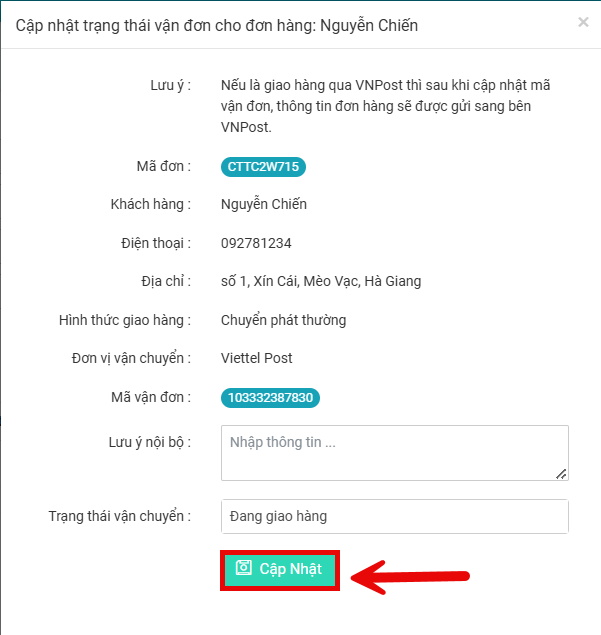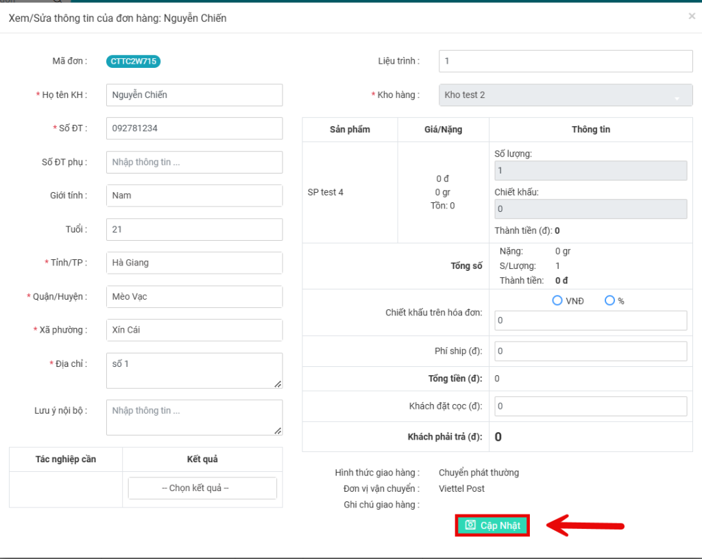 - Người sử dụng điều chỉnh thông tin khách hàng/ địa chỉ nhận hoặc thông tin đơn hàng (Nếu có), sau đó click nút " Cập nhật"