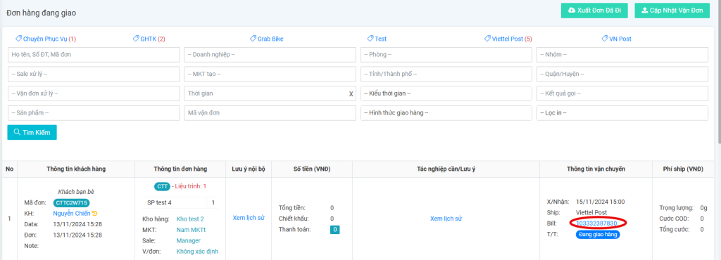 - Người sử dụng nhấp vào mã vận đơn để cập nhật trạng thái vận đơn cho đơn hàng tương ứng. Nếu không thấy mã vận đơn khi đó đơn vị vận chuyển sẽ gửi lại thông tin.
