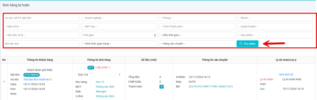 - Nếu người sử dụng muốn lọc danh sách đơn hàng bị hoàn theo điều kiện thì click vào “Tìm” để lọc danh sách đơn hàng theo các điều kiện như hình bên dưới.