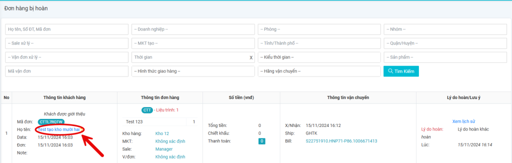 - Click vào tên khách hàng để thực hiện xem thông tin của đơn hàng tương ứng.
