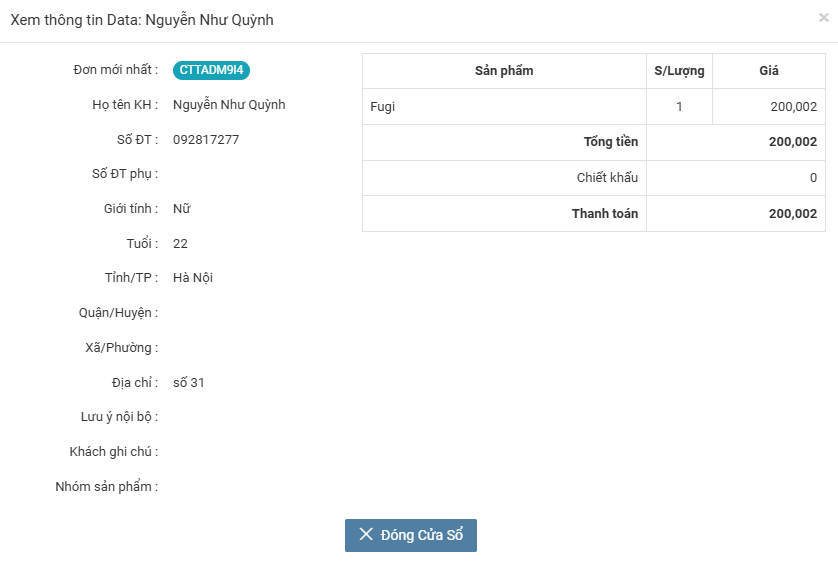 • Click vào tên khách hàng ở cột thông tin để thực hiện xem thông tin data của khách hàng tương ứng và thông tin chi tiết khách hàng sẽ hiển thị ra trong pop-up như hình bên dưới.
