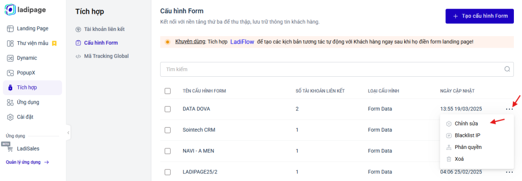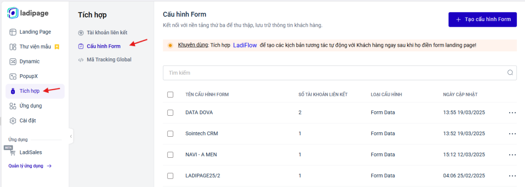Bước 2: Từ menu Ladipage chọn danh mục "Tích hợp" sau đó chọn "Cấu hình Form"