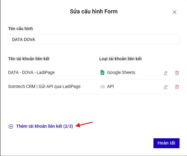 Bước 4. Tiếp tục từ bảng sửa cấu hình form chọn "Thêm tài khoản liên kết"