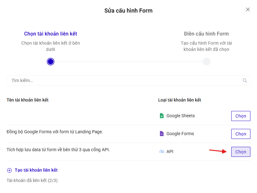 Tiếp đến chọn loại tài khoản liên kết là "API"