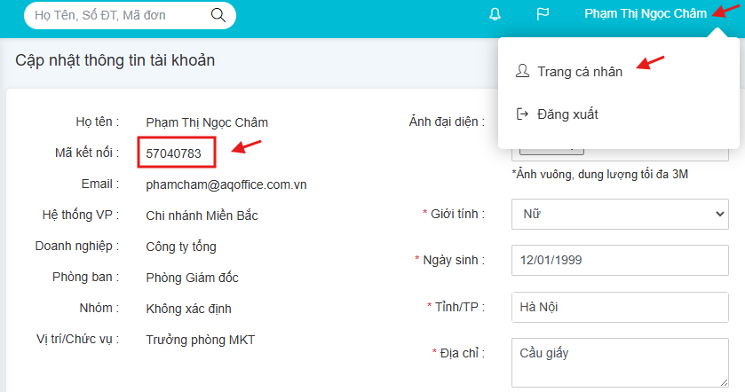 • Thay đổi {Mã kết nối CRM} thành mã kết nối trong tài khoản CRM