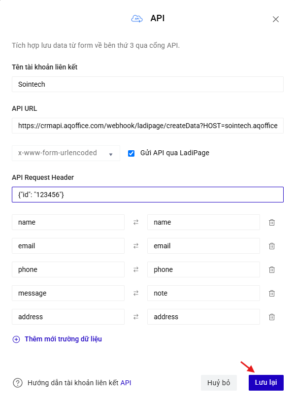 API URLhttps://crmapi.aqoffice.com/webhook/ladipage/createData?HOST={Domain CRM}