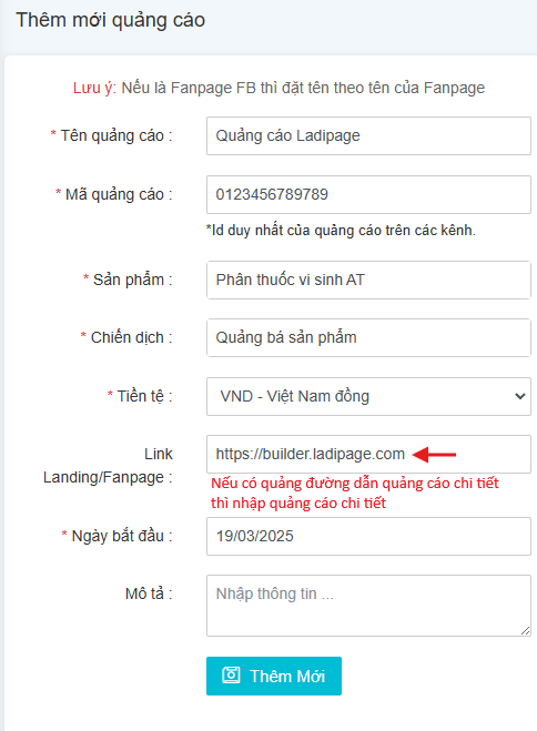 Cuối cùng: Tạo quảng cáo và thêm link Ladipage trên CRM