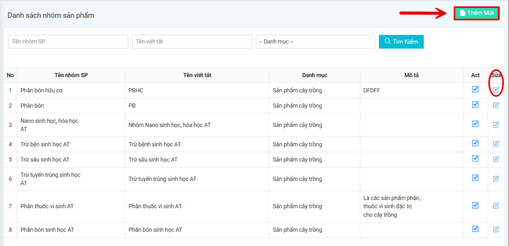 • Click: “Thêm mới” ở góc bên phải hoặc lựa chọn Sửa thông tin nhóm sản phẩm.