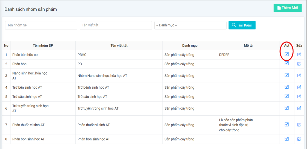 • Sau đó, người sử dụng click vào “Act” để kích hoạt trạng thái hoạt động cho nhóm sản phẩm tương ứng.