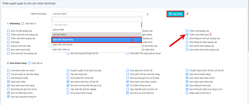 • 2. Chọn nhóm tương ứng muốn phân quyền quản trị