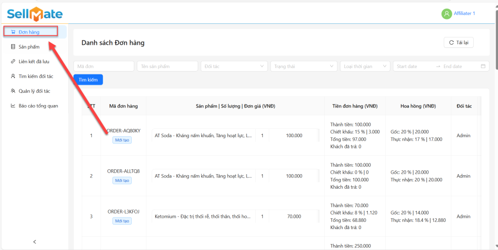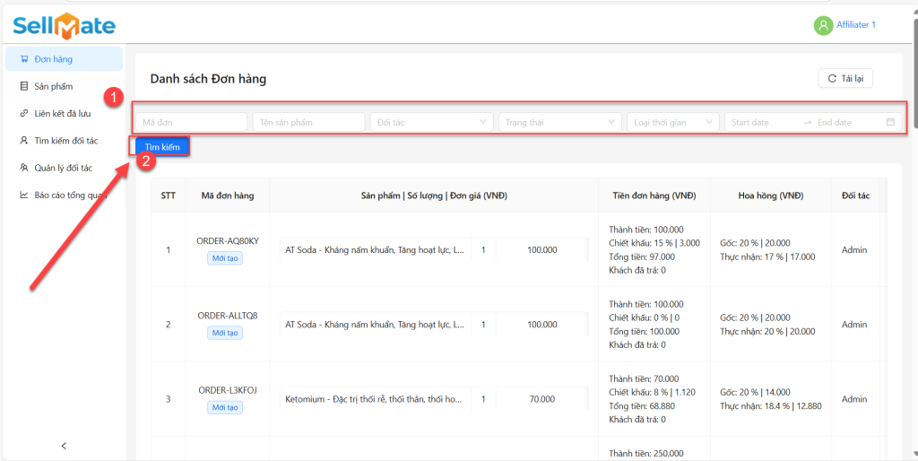 Ngoài ra để có bộ lọc đơn hàng theo mã đơn, tên sản phẩm, đối tác, trạng thái đơn hàng. Người dùng nhập/chọn và ấn nút tìm kiếm