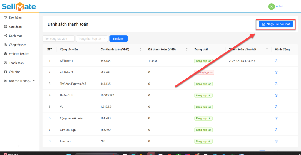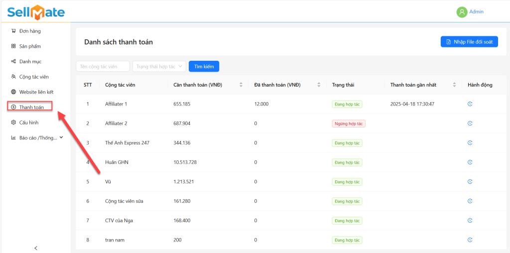 Trang “Danh sách thanh toán” giúp quản lý các khoản hoa hồng cần thanh toán cho cộng tác viên. Tại đây, nhà cung cấp có thể theo dõi số tiền đã thanh toán, số tiền còn phải chi trả, trạng thái hợp tác của từng cộng tác viên, và lịch sử thanh toán gần nhất. Tính năng nhập file đối soát hỗ trợ đối soát các khoản thanh toán cho công tác viên