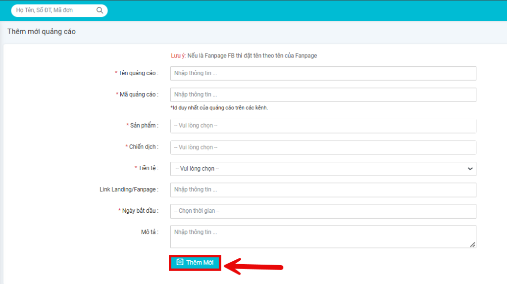 1. Click “Thêm mới quảng cáo” ở tab phía trái màn hình